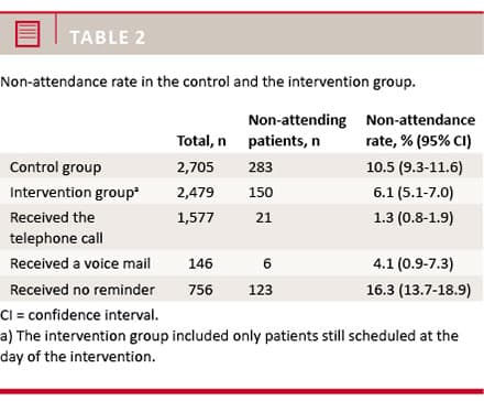 In patients who actually received the telephone reminder (PP), an even greater reduction of the non-attendance rate was observed (88%). As only 64% of the patients in the intervention group received the reminder, which is a lower fraction than reported in previous studies [6-8], the effect of the intervention could have been even greater if contact rates were improved, e.g. through continuously updating telephone numbers in the patient files and by contacting patients “out of hours”. However, it also has to be considered if patients, who did not answer the telephone, represent a high-risk subpopulation, making the before mentioned PP estimate too optimistic. Thus, the non-attendance rate in this subpopulation was 16.3% compared with 10.5% in the control group, and 1.3% among patients receiving the reminder.
