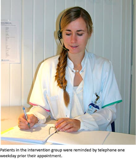 Notwithstanding these uncertainties, the effect of the telephone reminder in this study is in line with previous findings [3, 4]. However, it is unknown if these results can be extrapolated to other specialties. Thus, a large-scale Canadian study showed that being a patient in the gastroenterology division was an independent predictor for non-attendance [4]. This indicates that, compared to the general patient population, the present patient group represents a population that may respond differently to reminders than other populations.