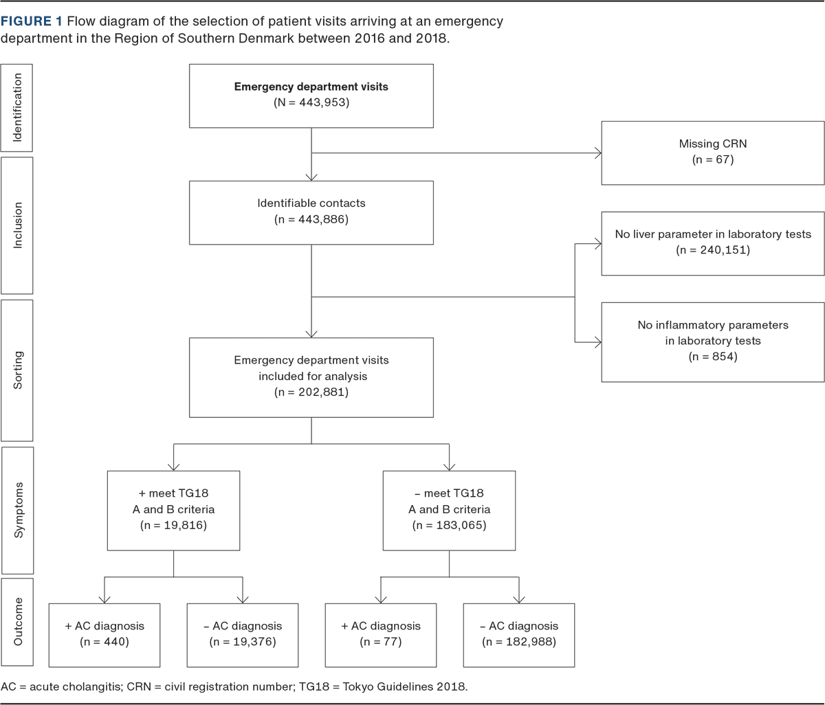 METHODS. The study was designed as a cohort study of adult ED patient visits in the Region of Southern Denmark. The cohort included patient visits collected from seven EDs between 1 January 2016 and 20 March 2018. We examined the diagnostic accuracy of the TG18 A and B criteria. This project was approved by the Danish Patient Safety Authority (identifier 3-3013-2272/1). The Region of Southern Denmark authorised data storage (identifier 17/24904, amendment identifier 20/24502).