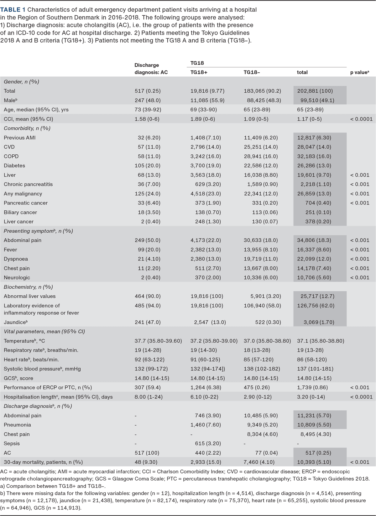 INTRODUCTION. Acute cholangitis (AC) is associated with a high mortality even among treated patients. Therefore, early diagnosis and treatment are important for improving prognosis. We investigated the discriminatory ability of the Tokyo Guidelines 2018 (TG18) regarding the presence of inflammation (A criterion) and affected liver parameters (B criterion) as a guide to diagnose AC among unselected patients in the emergency department (ED).