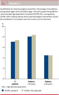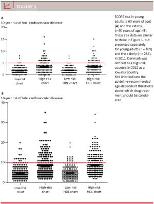 Figure 2 shows the same data for young adults and the elderly separately. With the SCORE charts created for use in low-risk European countries (Denmark 2012), less than 5% of young adults hospitalized for a first AMI qualified for drug treatment before the event, compared with 28% (p < 0.0001) with the SCORE chart created for use in high-risk European countries (Denmark 2011). Similar results were obtained with the HDL-adjusted risk charts.
