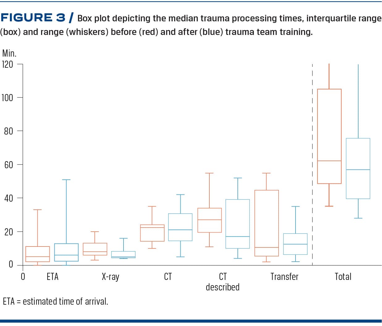 Processing times pre-TTT compared with post-TTT were not statistically significantly reduced (Figure 3). However, the median total processing time was reduced from 62 minutes to 57 minutes until transfer to a ward or an operating theatre (p > 0.05), and 75% of all trauma cases were handled within 75 minutes compared with 105 minutes before TTT (p > 0.05).