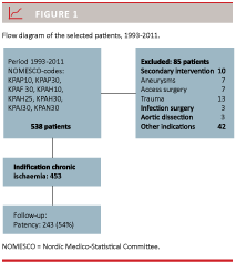 Two patients died within 30 days which is equivalent to an early mortality rate of 0.9%. Six (2.7%) reconstructions occluded before discharge. Complications were observed in 41 patients (19%). A total of 21 (10%) had wound complications (haematoma or lymphoedema), while infections were observed in two (1%) patients; one infection was deep and one was superficial. Surgical complications occurred in eight patients (4%) including two with nerve damage. General complications were observed in 14 patients (6%) and were predominantly cardiac (five), pulmonary (six) and stroke (two) related. The median admission time was four days (interquartile range 2-6 days). Half of the patients (117, 53%) were followed for one year, and of these 112 (96%) reconstructions were reported to have been open, whereas five were occluded and one was amputated with open reconstruction. At follow-up, 74 (70%) had no symptoms, 14 (13%) had exercise-induced pain and one (1%) had critical ischaemia with gangrene.