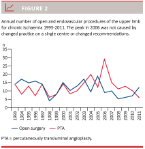 In the Danish cohort of arterial procedures, treatment for chronic ischaemia of the upper limb accounts for only 0.4% of the procedures, which is very low compared with the average of 4% reported in the literature [2, 5]. This difference may partly be explained by differences in selection criteria; viz. in the present study, acute and trauma procedures were excluded.