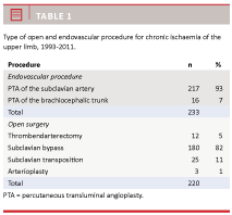 Endovascular dilatation, percutaneous transluminal angioplasty (PTA) and stenting of the stenotic lesion in the subclavian or axillarian artery is performed percutaneously. The open procedures include bypasses from the subclavian artery, transposition of the subclavian artery, arterioplasty and thrombendarterectomies (Table 1).