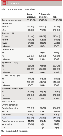 Results: Open reconstructions: Two patients died within 30 days, which is equivalent to a mortality rate of 0.9%. Six (2.7%) reconstructions occluded before discharge. Complications were observed in 41 patients (19%); the complications were predominantly related to surgical wound. At follow-up, 74 (70%) had no symptoms. Endovascular reconstructions: There were six deaths within the first 30 days, which is equivalent to an early mortality rate of 2.6%. Four (2%) reconstructions occluded before discharge. Complications were observed for 23 (10%) patients; the complications were predominantly of neurovascular origin. At follow-up, 90 (74%) had no symptoms. The one-year survival was 95% with no difference between the two groups.