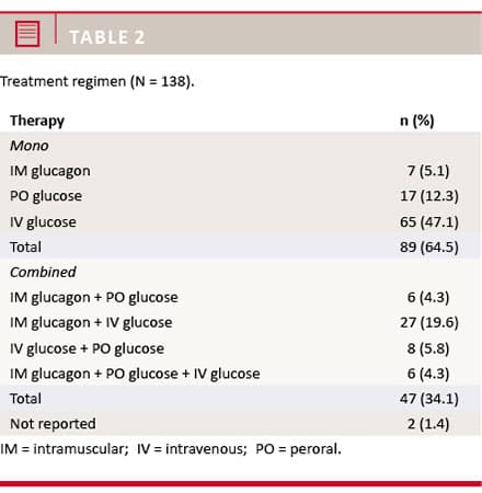 76.8% of the cases in this study received hypertonic glucose intravenously – either as mono- or combination therapy. Oral glucose or intramuscular glucagon or the two in combination was given in 21.7% of the cases.