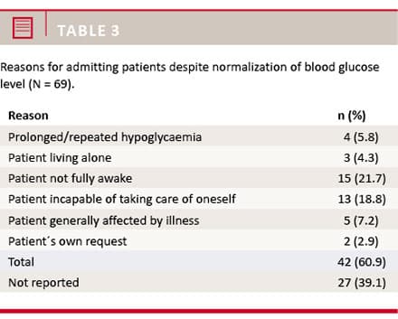 Cain et al reported that 75 of 220 patients who suffered from a hypoglycaemic episode required admission to hospital [8], whereas Mattila et al reported that 62 of 69 patients could safely be released at the scene following a hypoglycaemic episode [9].