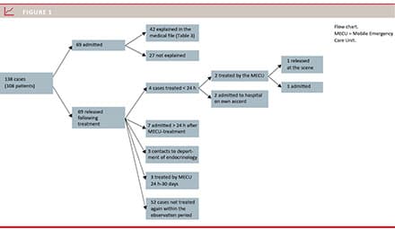 In Denmark, approximately 320,000 people have a diabetes diagnosis [1]. The actual number of affected persons may be 470,000, as many patients with type 2 diabetes are undiagnosed. In all, 10% of these patients are diagnosed with type 1 diabetes. The gender distribution is approximately equal. The mortality of diabetic patients is higher than the mortality of non-diabetic patients and mortality is associated with poor glycaemic control. However, tight glycaemic control increases the risk of clinically significant hypoglycaemia. Hypoglycaemia may be treated by a physician at the scene which may obviate admission to hospital [2, 3]. This medically directed treatment may be accomplished by dispatching a Mobile Emergency Care Unit (MECU) or, according to an Executive Order issued by the Danish Ministry of Health, by a paramedic who may release the patient at the scene following consultation with a physician [4].