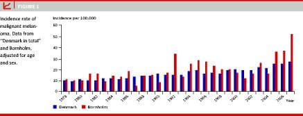 Bornholm is an island in the Baltic Sea, situated to the South East of Denmark. It consists of bedrock and enjoys climatic conditions slightly different from those of the rest of Denmark. Its population is comparable to that of the rest of the country, but probably more prone to outdoor activities and exposure to ultraviolet (UV) light. Differences in melanoma incidence within the Danish population could help us understand the contribution of UV exposure to the documented increase in incidence.
