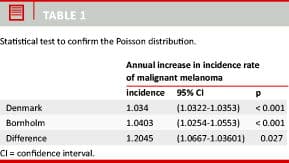 By comparing incidence rates on the basis of the Poisson distribution parameters, we found that melan-oma incidence rates on Bornholm are significantly higher than the corresponding Danish rates. The difference was estimated to constitute 20.5% (Table 1).