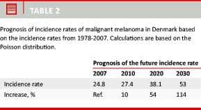 It is estimated that the melanoma incidence rate in Denmark will rise by more than 50% by 2020 and by more than 100% by 2030 compared with 2007. In order to reduce the increase in melanoma incidence rate, further prevention campaigns are needed. Campaigns should primarily focus on high-risk individuals according to phenotypic characteristics and on groups displaying risk behaviour.