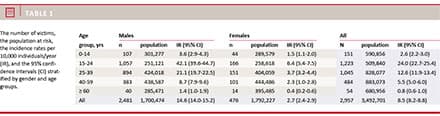 In the study period, 26 victims died from their lesions (8.7 per 1,000 victims), 12 males (4.8 per 1,000 victims) and 14 females (29.1 per 1,000 victims). The overall mortality rate was 7.4 per 1,000,000 population/years. The mortality rate for males and females were 7.1 and 7.8 per 1,000,000 population/years, respectively.