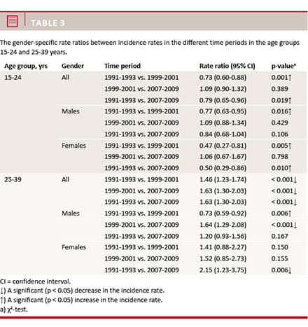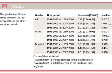 (p < 0.000) between the first and second, and the second and third time period was observed. Among males, the overall incidence rate was 14.6 (95% CI: 14.0-15.2) per 10,000 population/year and the same time trend was observed. The overall incidence rate for females was 2.7 (95% CI: 2.4-2.9) per 10,000 population/years, and this did not change significantly when comparing any of the periods.