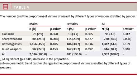 Table 4 shows the number and the proportion of victims by type of weapon. A total of 40 victims (1.4%) had injuries from more than one type of weapon. The proportion of victims with injuries from sharp weapons decreased significantly in the study period among males (trend test, p = 0.004) and in the overall group (trend test, p = 0.008).