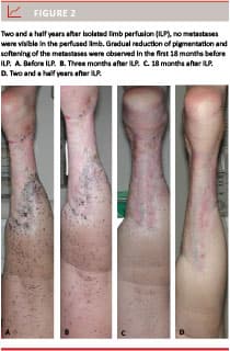 ILP is a technically demanding intervention that must be performed in institutions with a high level of cross-disciplinary expertise. Due to a lack of controlled studies, the effect on survival cannot be evaluated. However, the outstanding antitumor effect (Figure 2), i.e. 50-100% local tumour reduction in the vast majority of patients, may be hypothesised to lead to improved quality of life and possibly to prolonged survival.