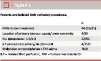 Material and methods: A total of 84 perfusions were performed (53 women, 31 men, median age 63 years) from 1993 to 2010. 95% of the perfusions were administered to the lower limbs and 5% to the upper limbs. The inclusion criteria were recurrent and/or clinically apparent cutaneous/subcutaneous extremity in-transit melanoma metastases.