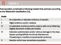 Limb function was assessed after four weeks. In general, the adverse events were mild and limited to the perfused extremity: oedema (32%), paraesthesia (13%), pain (7%) and hyper-pigmentation of the perfused limb (7%). None had loss of limb function.