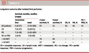 Recurrence-free survival (Table 3) from the time of ILP was a median of seven months for patients with CR and PR. Survival (Table 3) was a median of 17 months with wide ranges (0-185 months), a little longer in responders, and much shorter but with fairly wide ranges in patients with NC or progression. The two- and five-year survival rates (Table 3) after ILP were 57% and 31%, respectively. Twenty-two patients died in the period between two and five years after ILP. Survival rates were markedly longer for patients without lymph node metastases than for patients with lymph node metastases.