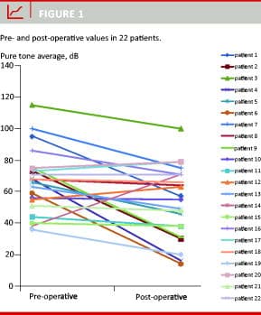 Results: The median pure tone average was 67 dB before surgery. Post-operatively, it was reduced to 55 dB. This is equivalent to a 12 dB (p = 0.008) improvement. Five patients improved beyond 30 dB and three patients out of 22 fulfilled the Belfast criteria for binaural hearing at the end of the observation period. Furthermore, three months after surgery, the incidence of vertigo and tinnitus had decreased from 58% to 8% and from 50% to 17%, respectively (p < 0.001 and p = 0.04). None of the patients experienced any severe or life-threatening complications.
