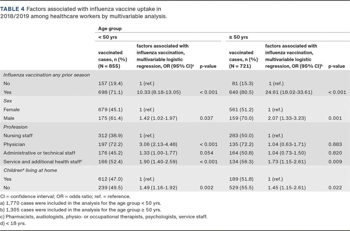 Prior influenza vaccination, age ≥ 50 years, male sex, employment in Laboratory departments, serving as a physician, and no children living at home were all significantly associated with vaccine uptake in univariable analysis. Regular patient contact was not. Multivariable analyses (Table 4) were performed for two age groups (≤ 49 and ≥ 50 years). Prior influenza vaccination was a predictor in both age groups; for ≤ 49 years (odds ratio (OR) = 10.33; 95% confidence interval (CI): 8.18-13.05) (p < 0.001) and ≥ 50 years (OR = 24.61; 95% CI: 18.02-33.61) (p < 0.001) compared with no prior vaccine. So was male sex for ≤ 49 years (OR = 1.42; 95% CI: 1.02-1.97) (p = 0.037) and ≥ 50 years (OR = 2.07; 95% CI: 1.33-3.23) (p = 0.001) compared with female sex and no children living at home; for ≤ 49 years (OR = 1.49; 95% CI: 1.16-1.92) (p = 0.002) and ≥ 50 years (OR = 1.45; 95% CI: 1.15-2.61) (p = 0.022) compared with having children at home. For participants ≤ 49 years, serving as a physician (OR = 3.06; 95% CI: 2.13-4.48) (p < 0.001) was a predictor compared with all other professions, whereas serving as service or additional health staff was a predictor (OR = 1.73; 95% CI: 1.15-2.61, (p = 0.009) for participants ≥ 50 years compared with all other professions. Nursing staff had the lowest odds for vaccination in both age groups.