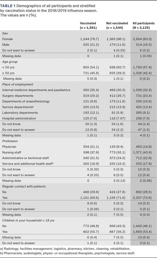 Baseline characteristics for all participants: Sex (male/female), age (in categories from ≤ 29 to ≥ 70 years), place of employment (Department of Internal Medicine and Paediatrics /Surgery/Department of Anaesthesiology/Laboratory Department/Service Departments (Radiology, Facilities Management, Logistics, Pharmacy, Kitchen, Cleaning and Rehabilitation)/Hospital Administration), profession (physician/nursing staff/administrative or technical staff/service or additional health staff), regular patient contact (yes/no), children < 18 years (yes/no) and influenza vaccine uptake 2018/2019 (yes/no).