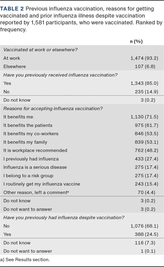 Participants vaccinated in 2018/2019: vaccinated at work (yes/no), previous influenza vaccine (yes/no), reasons for accepting the vaccine (Vaccination was recommended by my workplace/I belong to a risk group/It benefits myself/It benefits the patients/It benefits my family/It benefits my colleagues/ I think flu is a serious illness/ I've had the flu before/ I justfollow vaccination routine) with optional commenting facility for respondents, side effects (no/yes/systemic/local/other), absent from work due to side effects (yes/no) and had influenza despite vaccination (yes/no).