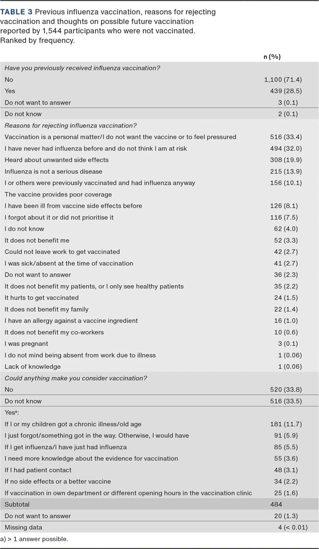 To our knowledge, this is the first Danish study on this topic. Prior influenza vaccination was a predictor for vaccine uptake, as also presented in other studies [11-13]. This indicates that past experiences lay the grounds for future vaccination patterns. Hence, staff attending educational stays at the hospital and the newly employed should be targeted in this respect. Women, participants ≤ 49 years and participants with children living at home were all less likely to be vaccinated. This also applied to all non-physicians in the group ≤ 49 years. These findings concur with those reported by similar studies [14-16]. Being young or having small children may be indicators of good health and no co-morbidity and, accordingly, of not considering influenza immunisation. In past studies, nursing staff has also scored low on vaccine acceptance [17, 18], which is undesirable since nurses come into close contact with and provide close care for vulnerable patient groups.
