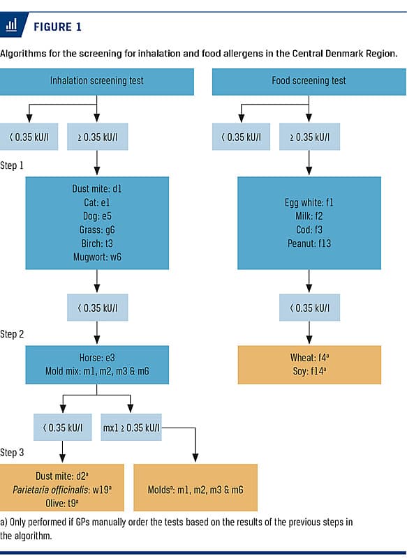 Allergy diagnoses should be based on the combined use of a detailed clinical history and assessment of sensitisation [3]. Sensitisation testing is usually performed as measurements of serum allergen-specific immunoglobulin E (sIgE) and/or skin prick tests. At the individual level, sensitisation assessed by sIgE tests is only loosely related to the probability of having clinical symptoms of allergy. A detailed patient history is needed to decide whether sIgE testing is warranted, and thus raise the positive predictive value of the test. If there is correspondence between the clinical history and sensitisation tests, a diagnosis may be made. If not, other sensitisation tests and/or challenge tests are needed [4]. In the Central Denmark Region, the regional reimbursement to the GPs in relation to patient diagnosis and treatment covers sIgE testing, but not other sensitisation tests, which are therefore not performed by GPs. According to the Danish Society of Allergology, it is relevant for GPs to test for sensitisation only against the following allergens: birch, grass, mugwort, horse, dog, cat, house dust mites and certain moulds. Testing for all other allergens should be done only by specialists [5]. A clinical guideline made by specialists in the region has similar recommendations about inhalant allergens, but also recommends testing for food allergens [6]. The guideline thus recommends the use of sIgE screening tests (a mix of the most relevant allergens) for inhalant allergens and food allergens, Figure 1, and other sIgE tests only in case of direct suspicion of a specific allergen. No studies describe to which extent these recommendations are followed by the GPs. The aim of this study was to describe the use of sIgE tests in the Central Denmark Region with a view to enabling a discussion about whether allergy diagnostics by GPs may be optimised.
