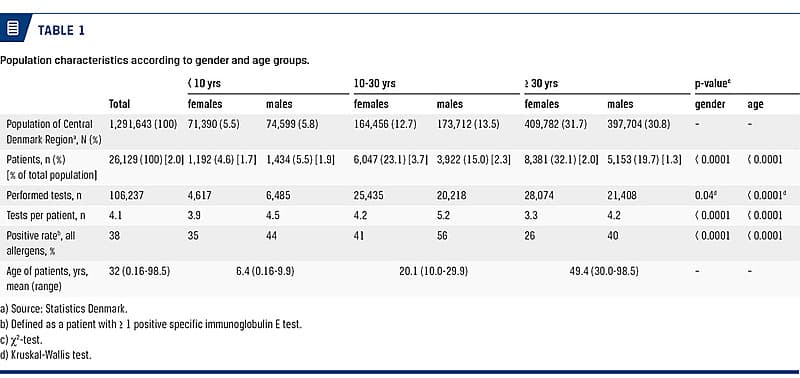 A total of 26,129 patients, corresponding to 2% of the total population of all ages were tested for sensitisation. In all, 106,237 tests were performed, corresponding to an average of four tests per patient. Table 1 shows the numbers for males and females by age groups. Females were heavily overrepresented in the age groups ≥ 10 years, but males had more tests per patient than females (p < 0.001). Of all the tests performed, 31% were positive. However, 38% of the patients tested positive to at least one allergen. Between GPs, this ranged 0-56%. The positive rates were highest among males (40-56%), but also high for females aged 10-30 years (41%).