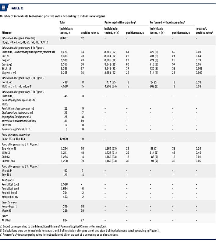 Positive rates were comparable for tests whether ordered as part of the screening or as single tests. We might have expected the rate to be higher when ordering individual tests than when ordering screenings, but this finding may indicate that the screening actually includes relevant allergens. On the other hand, the GPs may not be selective enough when ordering single tests. Further studies are needed to evaluate this.