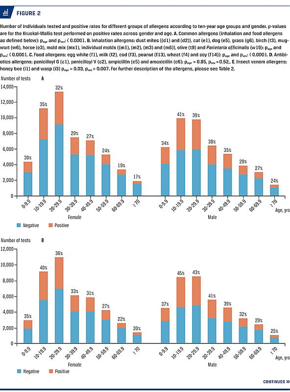 Figure 2 also shows positive rates for the different groups of allergens, grouped by age and gender. For inhalation allergens, the highest positive rates were found for patients aged 10-30 years, and this was also the group counting the largest number of tests performed.