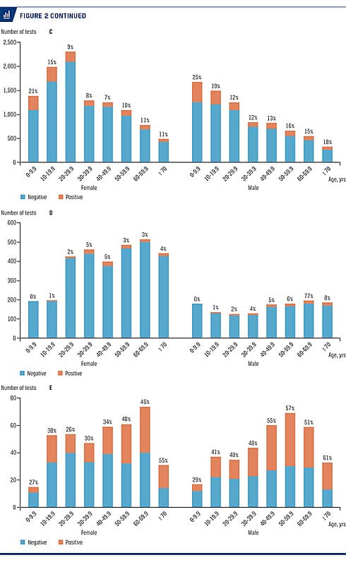 The positive rate per allergen is shown in Table 2. Screening tests were more often positive for inhalant allergens than for food allergens (42% versus 9%), but with considerable variance in the subsequent testing for single allergens. The positive rates for tests ordered as single tests were comparable to those of tests performed as part of the screening algorithms. The positive rates for antibiotics were low (between 2% and 6%, depending on age and sex), but higher for wasp and bee venom (60% and 26%, respectively).