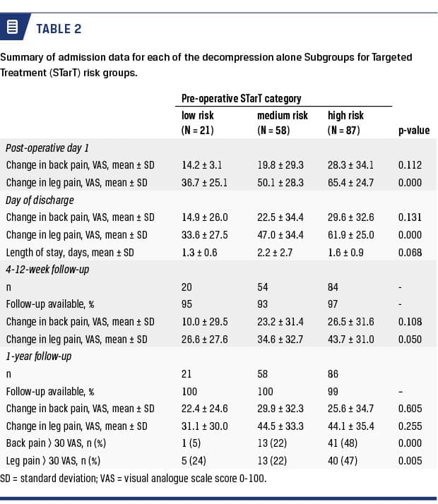 Decompression only. Of the 174 eligible consecutive subjects, 166 (95%) completed the STarT Back Screening Tool preoperatively, with a mean age of 59.28 ± 20.07 years. There were 83 (50%) males and 83 (50%) females, and 46 (28%) were smokers. A total of 87 (52%) had decompression and discectomy for disc herniation, and 79 (48%) had a decompression for spinal stenosis.