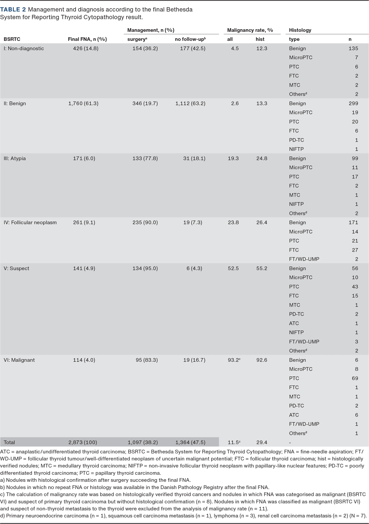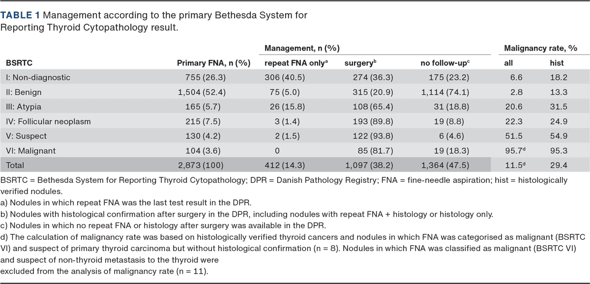 Some limitations of this study exist. First, clinical or imaging data are not included in the Danish Pathology Registry. Accordingly, follow-up with US without repeat FNA was not registered and cannot be separated from patients truly lost to follow-up. We do not have specific information about local guidelines at the clinical units comprised by our study. However, Danish centres and clinicians largely comply with national guidelines on the use of US risk stratification, thyroid scintigraphy and FNA [2]. Second, environmental (e.g. iodine), epidemiological and logistic conditions specific to Danmark may differ from those of other countries, and this may influence the external validity of our study. Third, an unexpectedly high number of patients with Malignant (BSRTC VI) FNA did not undergo surgery. This is likely due to a subset of patients with non-thyroid metastases to the thyroid and thyroid cancer patients with severe co-morbidities that contraindicated thyroid surgery. Finally, the WHO classification was revised in 2017 [8], introducing new histological categories. This might explain the infrequent occurrence of the diagnoses non-invasive follicular thyroid neoplasm with papillary-like nuclear features (NIFTP) and follicular thyroid tumour or well-differentiated neoplasm of uncertain malignant potential (FT/WD-UMP) in our study.
