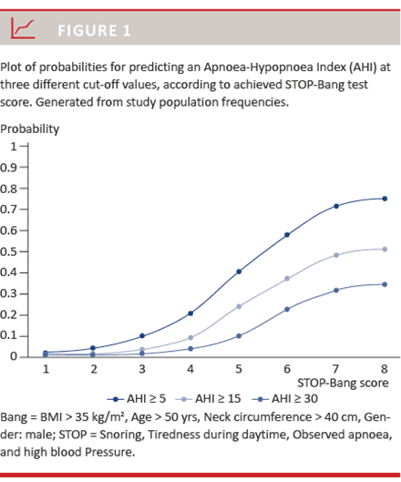 In addition, the probabilities for predicting an AHI of ≥ 5, ≥ 15 and ≥ 30 in patients according to their achieved STOP-Bang score values are presented in Figure 1.
