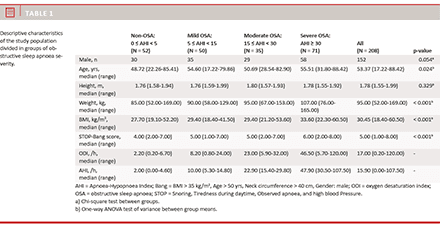 A population of 208 patients was studied and tested with the STOP-Bang screening tool and the CRM. In the study population, 73% were men, and the mean age was 53 years. The prevalence of OSA with AHI ≥ 15 was 51% (106 out of 208). The median AHI of the population was 15.90 ranging 0.00-107.50, and the median STOP-Bang score was 5.00 (range: 1.00-8.00). A quarter (52 of 208) of the study population had an AHI < 5. Descriptive characteristics of the study population are displayed in Table 1.