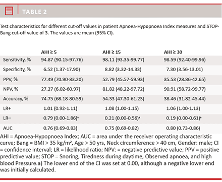 RESULTS: In the study population, 73% were males, and 51% of the population had an Apnoea-Hypopnoea Index (AHI) ≥ 15. The STOP-Bang screening tool had a sensitivity of 0.98 for detection of OSA with AHI ≥ 15 and a corresponding specificity of 0.09. Hence, the questionnaire is able to detect almost all patients suffering from OSA. However, using the tool will cause many healthy subjects to be falsely classified as having OSA.