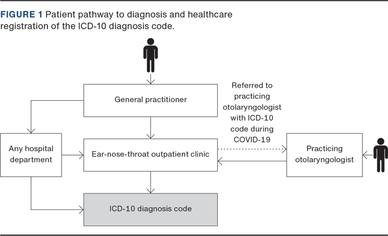 Patients suffering from obstructive sleep apnoea may contact their general practitioner who may then refer them to an ear-nose-throat (ENT) outpatient clinic, or they may contact a practicing otolaryngologist directly without referral, see Figure 1. Formal diagnosing with sleep monitoring equipment is performed solely via ENT outpatient clinics and at specialised private otolaryngologists. Some practicing otolaryngologists refer sleep apnoea patients to hospital ENT outpatient clinics for further treatment/diagnosing. An ICD-10 diagnosis, with or without formal diagnosing with sleep monitoring equipment, may be given during hospitalisation at any given department, including an ENT outpatient clinic. Additionally, patients referred from the hospital to a practising otolaryngologist receive a diagnosis code, which is then registered by the hospital department prior to the actual performance of the diagnostic test in the private clinic. This type of referral was especially relevant during the COVID-19 pandemic in 2020 because some of the hospitals’ ENT functions were shut down.