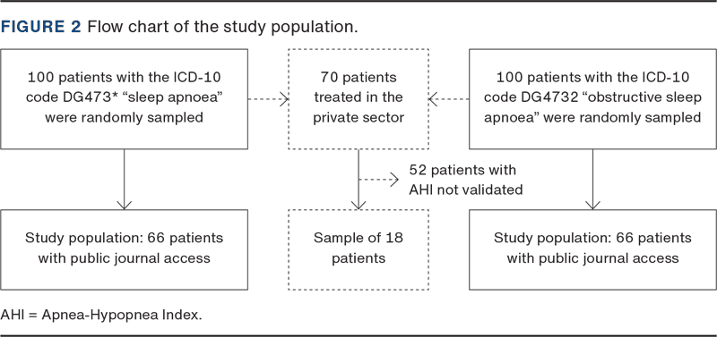 The Danish National Patient Registry was used to randomly sample 100 patients with an ICD-10 code of DG4732 as a primary or secondary diagnosis code, and another 100 patients with DG473*, registered during 2020, using data from the North Denmark Region as seen in previous validation studies [9], see Figure 2. Diagnoses needed to be incident-occurring diagnoses. As medical records were unavailable for patients referred from the hospital to the private sector, these patients were excluded from the primary study population. See eTable 1 for an overview of the diagnose codes for “sleep apnoea”.