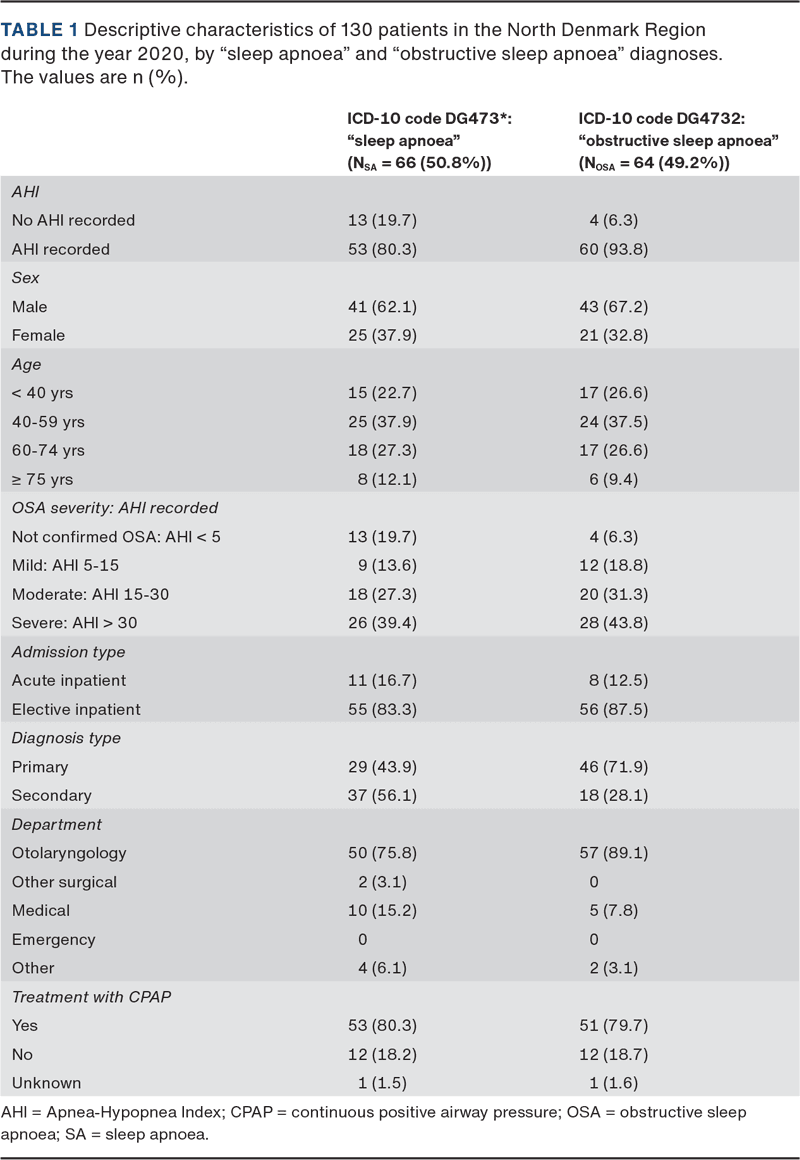 Valid data on obstructive sleep apnoea are important in epidemiological studies investigating the risk and prognosis for patients diagnosed with obstructive sleep apnoea. Hospital discharge registries may be a valuable and cost-effective source of epidemiological research in obstructive sleep apnoea provided records of diagnoses are valid. Despite its potential importance, the International Classification of Diseases, tenth version (ICD-10), hospital diagnosis of obstructive sleep apnoea has not been validated in a population-based healthcare system. Previous register-based studies have used both DG4732 (“obstructive sleep apnoea”) and DG473* (“sleep apnoea”) to identify patients with obstructive sleep apnoea [4, 5].