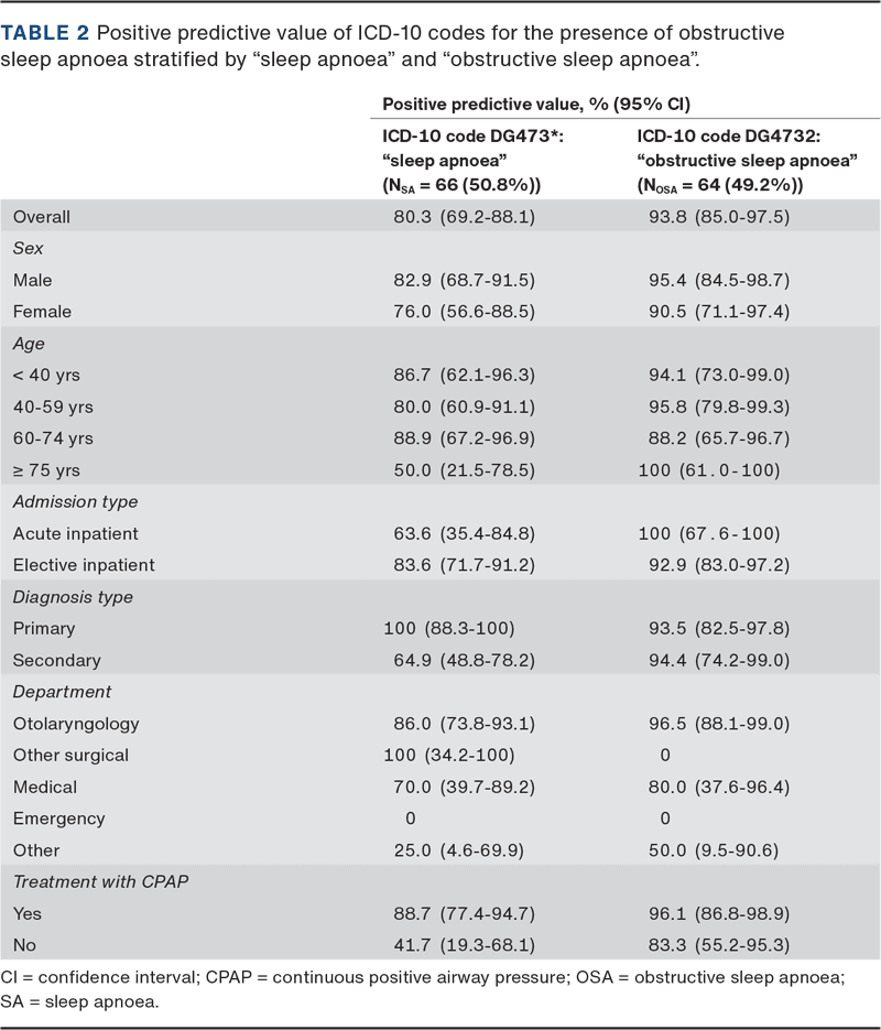 RESULTS. The study population included 130 patients, among whom 64 were diagnosed with “obstructive sleep apnoea”, and 66 patients were registered with “sleep apnoea”. The PPV for “obstructive sleep apnoea” was 93.8% (95% confidence interval (CI): 85.0-97.5%), and the PPV for “sleep apnoea” was 80.3% (95% CI: 69.2-88.1%).