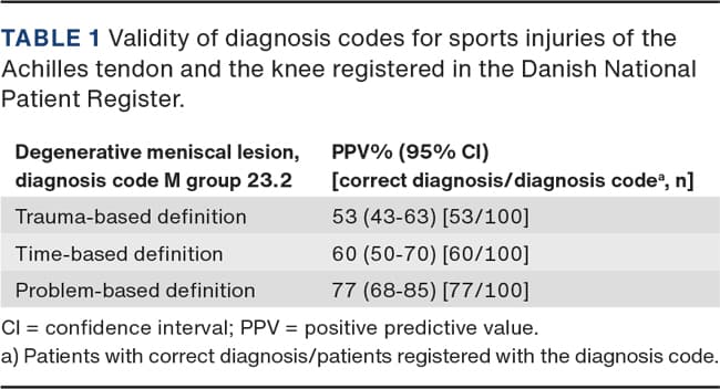 The aim of this study was to establish the validity of reporting of diagnosis codes to the DNPR based on the patient records for some of the most common lower limb sports injuries; acute Achilles tendon rupture [2], Achilles tendinitis [5], rupture of the anterior cruciate ligament of the knee (ACL rupture) [6], dislocation of the patella [7], traumatic tear of the meniscus and degenerative meniscal lesion [8].