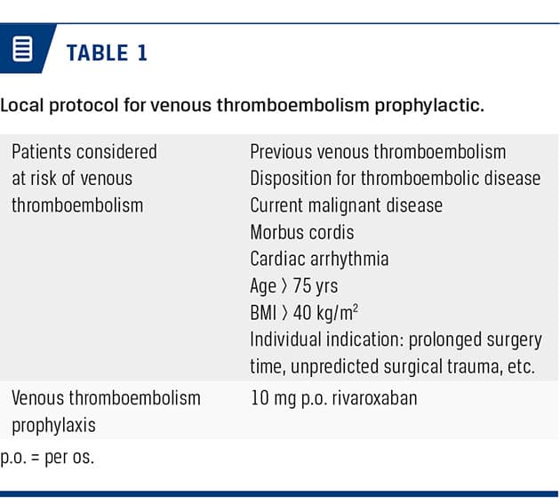In the period studied, all patients identified to have an increased risk of VTE (Table 1) received thrombosis prophylaxis in the form of 10 mg rivaroxaban orally 6-10 hours after the procedure according to national guidelines for thrombosis prophylaxis [10-14]. All patients were planned for early mobilisation within a few hours following the procedure. In patients with prolonged mobilisation, rivaroxaban 10 mg was administered once daily until full mobilisation. Compression stockings were not part of the thrombosis prophylaxis regime.