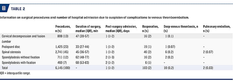 A venous thromboembolism (VTE), i.e., deep vein thrombosis (DVT) or pulmonary embolism (PE), is a well-described complication following surgery [1], including surgery for degenerative spinal disease [2-9]. The clinical presentation of a VTE ranges from asymptomatic to fatal. Thrombosis prophylaxis may be administered to patients who are undergoing surgery to lower the risk of VTEs. The incidence of a symptomatic VTE following spinal surgery where thrombosis prophylaxis is administered is reported to fall in the 0.2-1.1% range [5, 6].