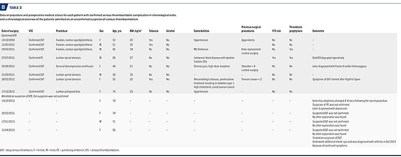 seven DVT and one PE. Patient characteristics and procedures performed are presented in Table 3. In one patient, a high preoperative risk of VTE was identified according to the treatment protocol. One other patient, a 66-year-old male, received thrombosis prophylaxis because he underwent instrumented fusion for a spondylolisthesis and had a Body Mass Index of 34. All the other VTE occurred in patients without increased risk.