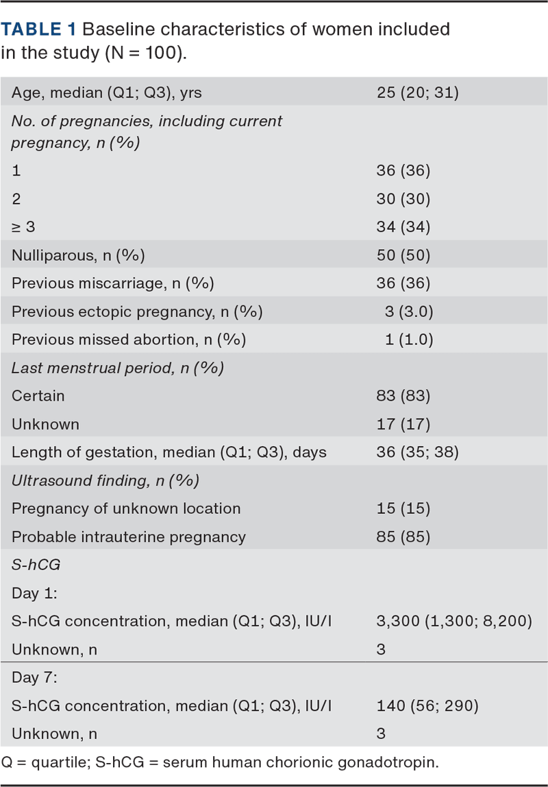 We included 100 women seeking medical abortion with an estimated gestational age of no more than 42 days (6+0 weeks), in whom an IUP had not been confirmed by transvaginal ultrasound. Ultrasound findings included either a thickened endometrium and/or a gestational sac without a yolk sac or embryonic structures [8].