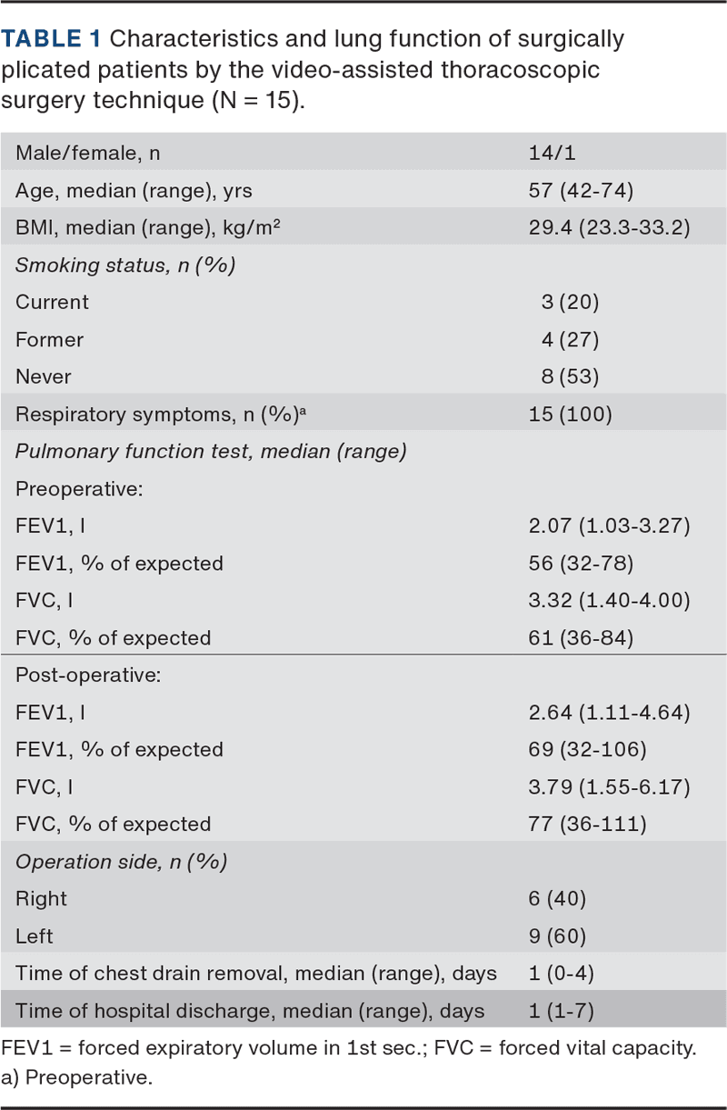 Fifteen patients underwent surgery. Table 1 shows baseline and surgical characteristics. The median duration of surgery was 81 minutes (range: 61-133). The median hospital stay was one day (range: 1-7 days). Three patients had prolonged stays: two due to air leakage and one because of a splenic haematoma.