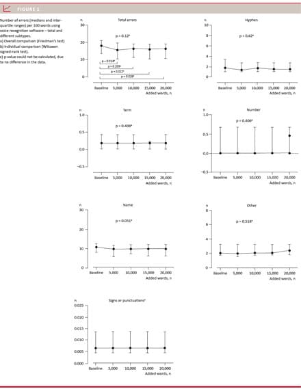In our research department, we use the VRS as a standard tool to produce transcriptions of scientific articles of a high initial accuracy. However, this may require a considerable amount of training with the VRS. In our experience, this VRS program for transcription of dictated scientific articles may become completely error-free through additional training of the program. This was not tested in the present study and may be the subject for a future study. A study evaluating 1 month’s use and training of VRS in a clinical department found that this was insufficient to achieve complete accuracy [5]. However, this was for clinical use and not for dictation of scientific articles, and it was unclear how the training was performed in the study. For dictation of scientific articles, VRS may be a feasible option since a secretary service is not available in many research departments. Moreover, this study evaluated the use of VRS in non-native English researchers dictating in English language. Thus, the transcript may have been more accurate if the authors had been native English speakers. Lastly, using non-validated scales, a statistically significant difference as found in the present study may not necessarily translate into a practically important difference. However, statistical testing was used as a tool to quantify the effect of the number of added words.