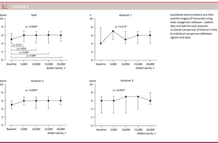 nature of data and the repeated measures design, Friedman’s test was used to evaluate the overall effect of added words, and significant values would indicate an increase or a decrease with an increasing number of added words. The Wilcoxon signed-rank test was used to compare the individual number of added words versus the baseline, but only when p < 0.05 in the Friedman analysis of the parameter in question. This was done to investigate the minimum number of words necessary to obtain an effect. The median number of errors and the median quality score as a result of number of added words are shown in Figure 1 and Figure 2, respectively. Interclass correlation coefficiency (ICC) was used to evaluate the degree of inter-observer variation between the three assessors (absolute agreement, two-way mixed model). ICC can be arbitrarily divided into the following categories: poor (< 0.00), slight (0.00-0.20), fair (0.21-0.40), moderate (0.41-0.60), substantial (0.61-0.80), and almost perfect (0.81-1.00) [11]. SPSS version 20 (SPSS Inc., Chicago, Illinois, USA) was used, and a p-value < 0.05 was considered statistically significant. Informed consent from the participants was obtained prior to the study. The study was exempt from ethical committee approval according to Danish law since it was not considered biomedical research, and no additional approvals were needed.